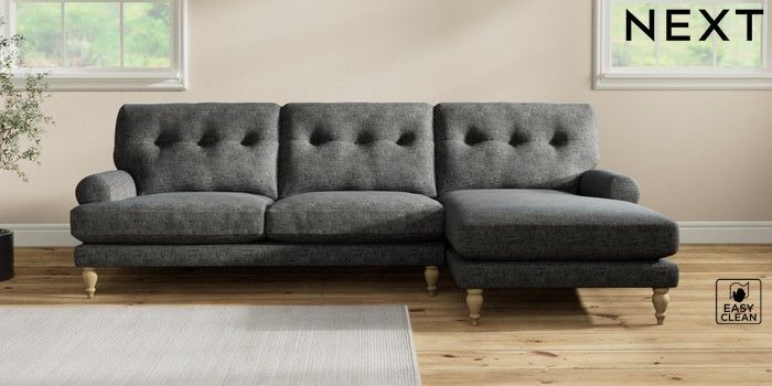 7.2.10 Erin Buttoned Back Deep Relaxed Sit Medium Sofa Chaise - Right Hand Boucle Weave Easy Clean Charcoal Grey High Classic Turned - Light | Made Click here to use our website with more accessibility support, for example screen readers