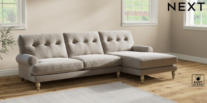 7.2.10 Erin Buttoned Back Deep Relaxed Sit Medium Sofa Chaise - Right Hand Chunky Boucle Easy Clean Dove High Classic Turned - Light | Made Click here to use our website with more accessibility support, for example screen readers