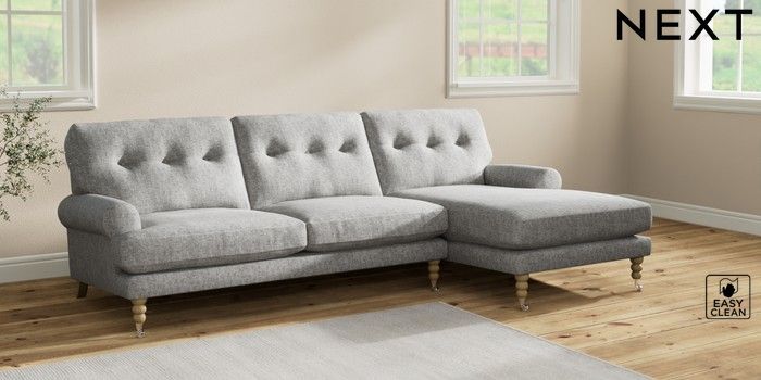 7.2.10 Erin Buttoned Back Deep Relaxed Sit Medium Sofa Chaise - Right Hand Chunky Boucle Easy Clean Light Grey High Classic Turned Chrome Castor - Light | Made Click here to use our website with more accessibility support, for example screen readers