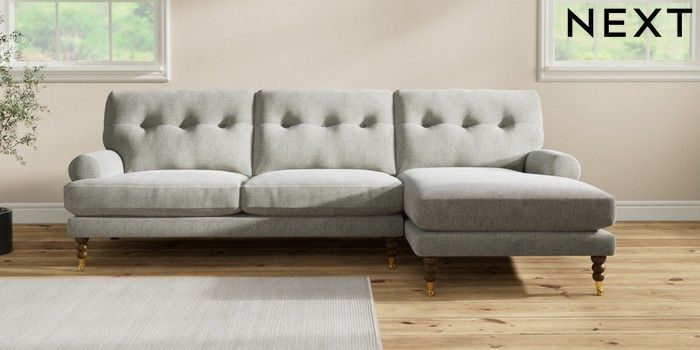 7.2.10 Erin Buttoned Back Deep Relaxed Sit Medium Sofa Chaise - Right Hand Chunky Chenille Light Grey High Classic Turned Brass Castor - Mid | Made Click here to use our website with more accessibility support, for example screen readers