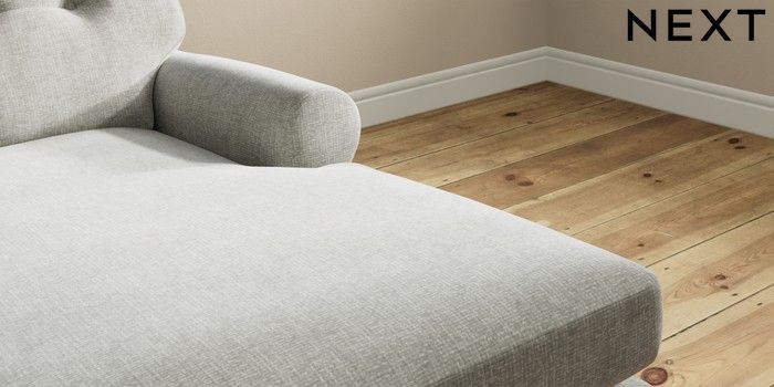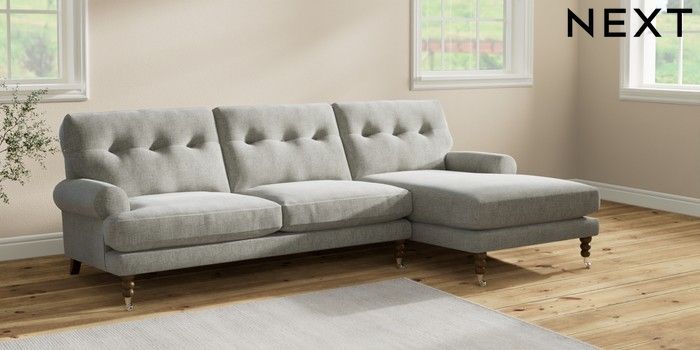7.2.10 Erin Buttoned Back Deep Relaxed Sit Medium Sofa Chaise - Right Hand Chunky Chenille Light Grey High Classic Turned Chrome Castor - Mid | Made Click here to use our website with more accessibility support, for example screen readers