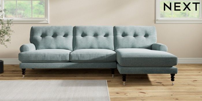 7.2.10 Erin Buttoned Back Deep Relaxed Sit Medium Sofa Chaise - Right Hand Chunky Chenille Light Teal Green High Classic Turned Chrome Castor - Dark | Made Click here to use our website with more accessibility support, for example screen readers