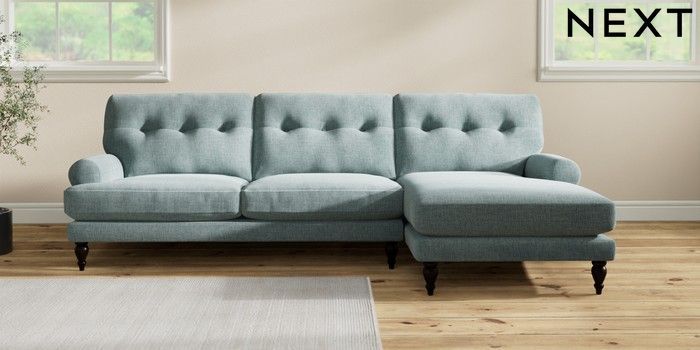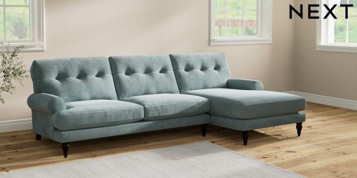 7.2.10 Erin Buttoned Back Deep Relaxed Sit Medium Sofa Chaise - Right Hand Chunky Chenille Light Teal Green High Classic Turned - Dark | Made Click here to use our website with more accessibility support, for example screen readers