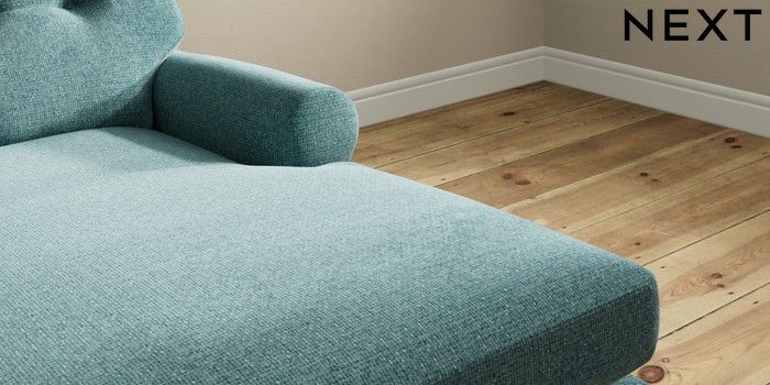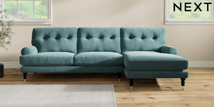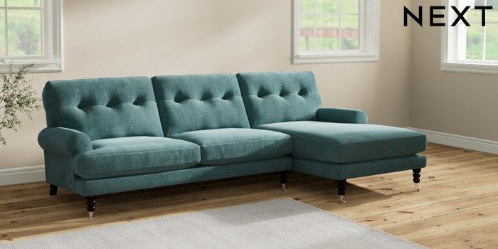 7.2.10 Erin Buttoned Back Deep Relaxed Sit Medium Sofa Chaise - Right Hand Chunky Chenille Mid Teal Green High Classic Turned Chrome Castor - Dark | Made Click here to use our website with more accessibility support, for example screen readers