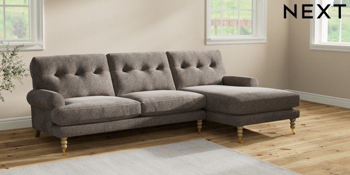 7.2.10 Erin Buttoned Back Deep Relaxed Sit Medium Sofa Chaise - Right Hand Chunky Chenille Mink Brown High Classic Turned Brass Castor - Light | Made Click here to use our website with more accessibility support, for example screen readers
