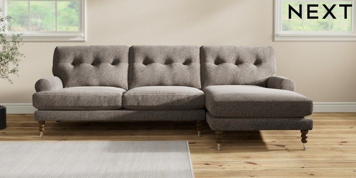 7.2.10 Erin Buttoned Back Deep Relaxed Sit Medium Sofa Chaise - Right Hand Chunky Chenille Mink Brown High Classic Turned Chrome Castor - Mid | Made Click here to use our website with more accessibility support, for example screen readers