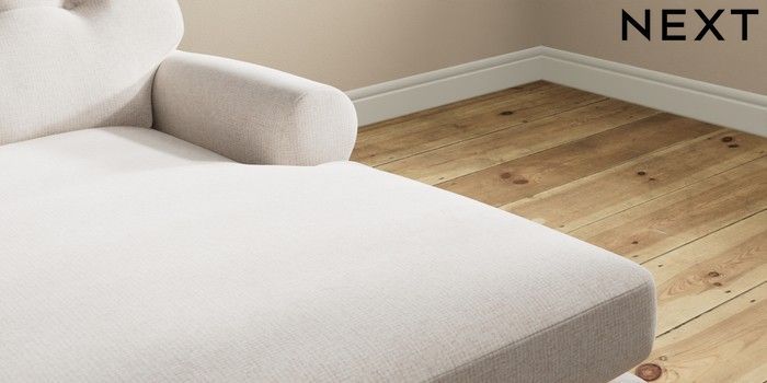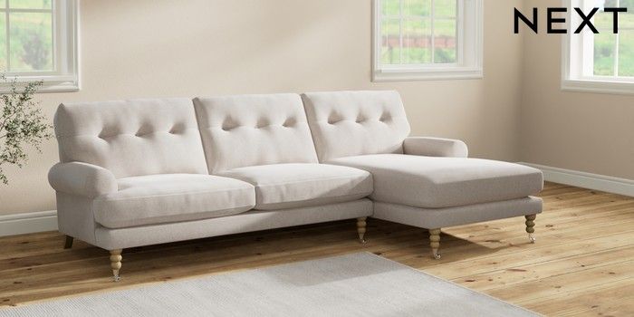 7.2.10 Erin Buttoned Back Deep Relaxed Sit Medium Sofa Chaise - Right Hand Chunky Chenille Oyster High Classic Turned Chrome Castor - Light | Made Click here to use our website with more accessibility support, for example screen readers