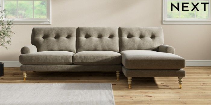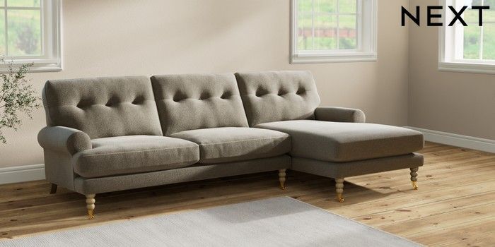 7.2.10 Erin Buttoned Back Deep Relaxed Sit Medium Sofa Chaise - Right Hand Chunky Marl Light Olive Green High Classic Turned Brass Castor - Light | Made Click here to use our website with more accessibility support, for example screen readers