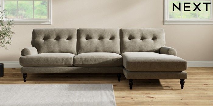7.2.10 Erin Buttoned Back Deep Relaxed Sit Medium Sofa Chaise - Right Hand Chunky Marl Light Olive Green High Classic Turned - Dark | Made Click here to use our website with more accessibility support, for example screen readers