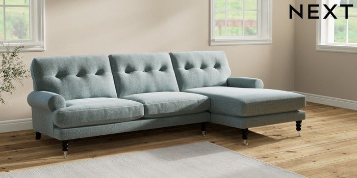 7.2.10 Erin Buttoned Back Deep Relaxed Sit Medium Sofa Chaise - Right Hand Chunky Marl Mid Blue High Classic Turned Chrome Castor - Dark | Made Click here to use our website with more accessibility support, for example screen readers