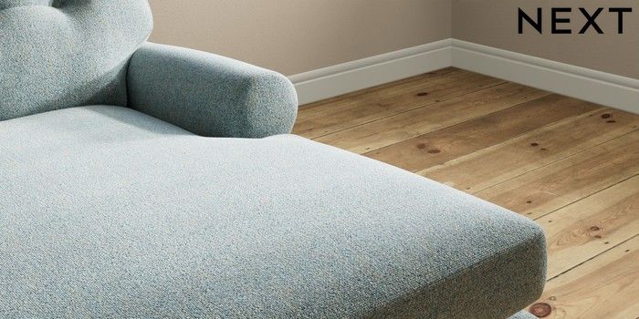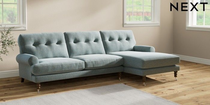 7.2.10 Erin Buttoned Back Deep Relaxed Sit Medium Sofa Chaise - Right Hand Chunky Marl Mid Blue High Classic Turned Chrome Castor - Mid | Made Click here to use our website with more accessibility support, for example screen readers