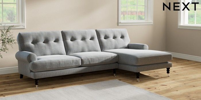7.2.10 Erin Buttoned Back Deep Relaxed Sit Medium Sofa Chaise - Right Hand Chunky Marl Mid Grey High Classic Turned Chrome Castor - Dark | Made Click here to use our website with more accessibility support, for example screen readers