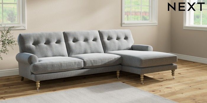 7.2.10 Erin Buttoned Back Deep Relaxed Sit Medium Sofa Chaise - Right Hand Chunky Marl Mid Grey High Classic Turned Chrome Castor - Light | Made Click here to use our website with more accessibility support, for example screen readers
