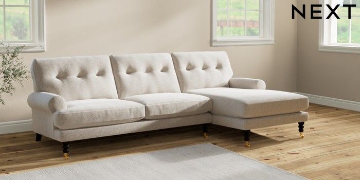 7.2.10 Erin Buttoned Back Deep Relaxed Sit Medium Sofa Chaise - Right Hand Chunky Marl Oyster High Classic Turned Brass Castor - Dark | Made Click here to use our website with more accessibility support, for example screen readers