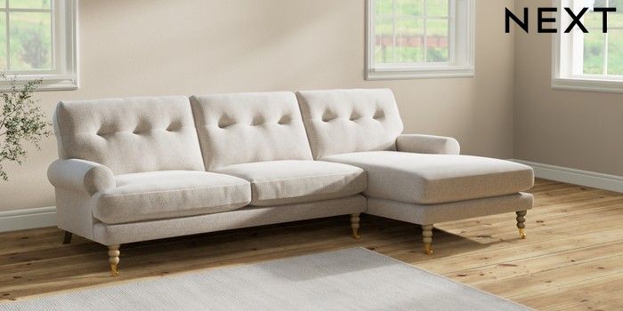 7.2.10 Erin Buttoned Back Deep Relaxed Sit Medium Sofa Chaise - Right Hand Chunky Marl Oyster High Classic Turned Brass Castor - Light | Made Click here to use our website with more accessibility support, for example screen readers