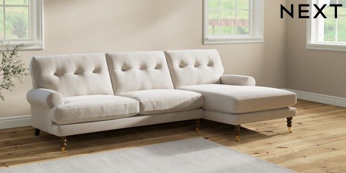 7.2.10 Erin Buttoned Back Deep Relaxed Sit Medium Sofa Chaise - Right Hand Chunky Marl Oyster High Classic Turned Brass Castor - Mid | Made Click here to use our website with more accessibility support, for example screen readers
