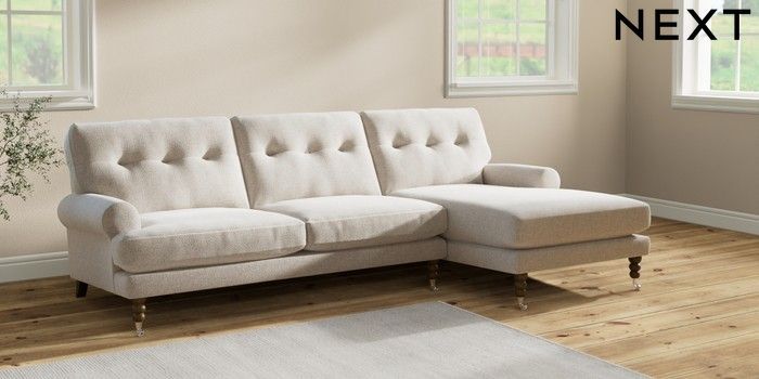 7.2.10 Erin Buttoned Back Deep Relaxed Sit Medium Sofa Chaise - Right Hand Chunky Marl Oyster High Classic Turned Chrome Castor - Mid | Made Click here to use our website with more accessibility support, for example screen readers