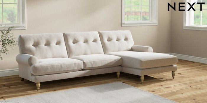 7.2.10 Erin Buttoned Back Deep Relaxed Sit Medium Sofa Chaise - Right Hand Chunky Marl Oyster High Classic Turned - Light | Made Click here to use our website with more accessibility support, for example screen readers