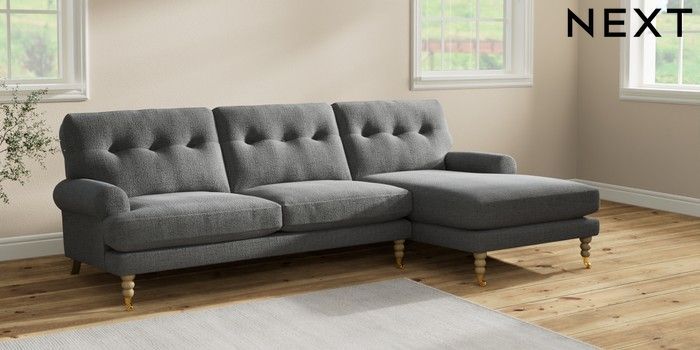 7.2.10 Erin Buttoned Back Deep Relaxed Sit Medium Sofa Chaise - Right Hand Chunky Texture Dark Grey High Classic Turned Brass Castor - Light | Made Click here to use our website with more accessibility support, for example screen readers