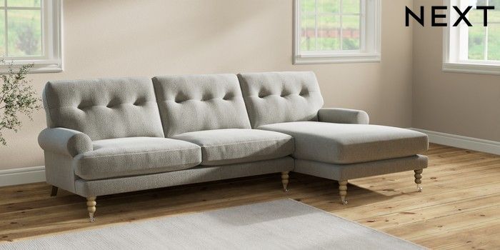 7.2.10 Erin Buttoned Back Deep Relaxed Sit Medium Sofa Chaise - Right Hand Chunky Texture Dove High Classic Turned Chrome Castor - Light | Made Click here to use our website with more accessibility support, for example screen readers