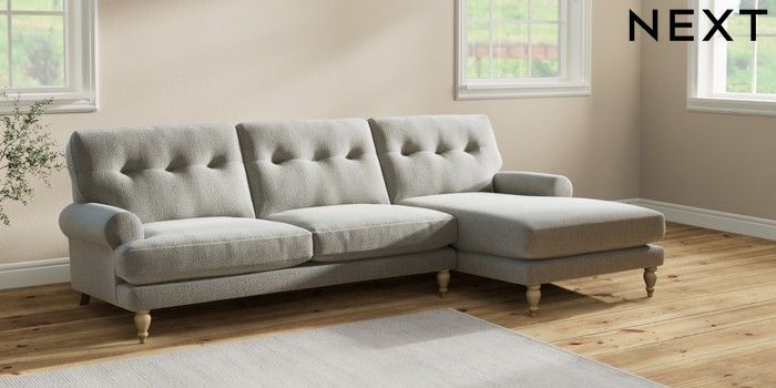7.2.10 Erin Buttoned Back Deep Relaxed Sit Medium Sofa Chaise - Right Hand Chunky Texture Dove High Classic Turned - Light | Made Click here to use our website with more accessibility support, for example screen readers
