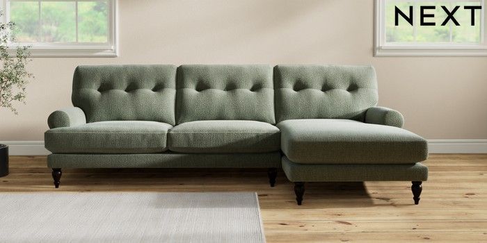 7.2.10 Erin Buttoned Back Deep Relaxed Sit Medium Sofa Chaise - Right Hand Chunky Texture Mid Forest Green High Classic Turned - Dark | Made Click here to use our website with more accessibility support, for example screen readers