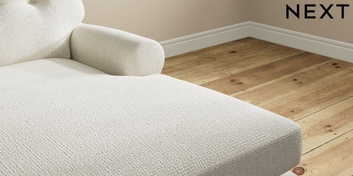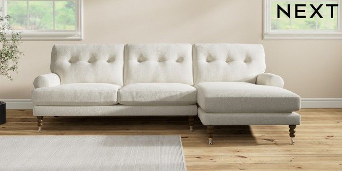 7.2.10 Erin Buttoned Back Deep Relaxed Sit Medium Sofa Chaise - Right Hand Chunky Texture Oyster High Classic Turned Chrome Castor - Mid | Made Click here to use our website with more accessibility support, for example screen readers