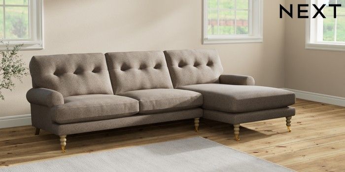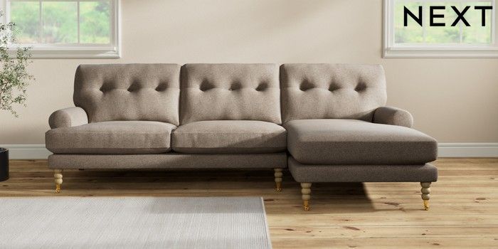 7.2.10 Erin Buttoned Back Deep Relaxed Sit Medium Sofa Chaise - Right Hand Chunky Weave Dark Natural High Classic Turned Brass Castor - Light | Made Click here to use our website with more accessibility support, for example screen readers