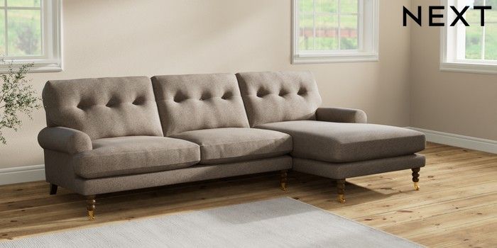 7.2.10 Erin Buttoned Back Deep Relaxed Sit Medium Sofa Chaise - Right Hand Chunky Weave Dark Natural High Classic Turned Brass Castor - Mid | Made Click here to use our website with more accessibility support, for example screen readers
