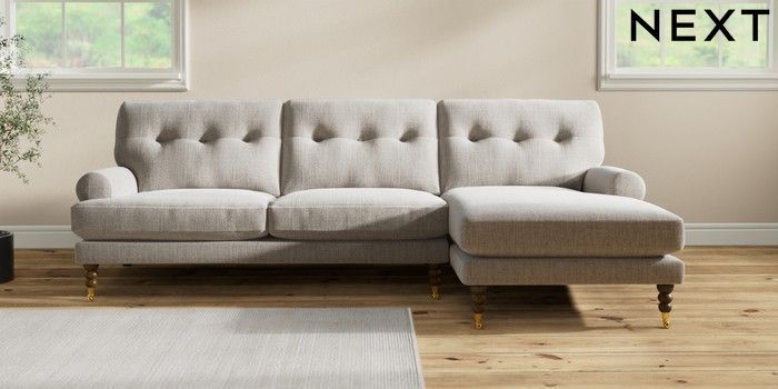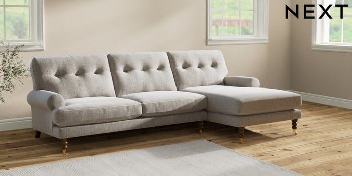 7.2.10 Erin Buttoned Back Deep Relaxed Sit Medium Sofa Chaise - Right Hand Chunky Weave Dove Grey High Classic Turned Brass Castor - Mid | Made Click here to use our website with more accessibility support, for example screen readers