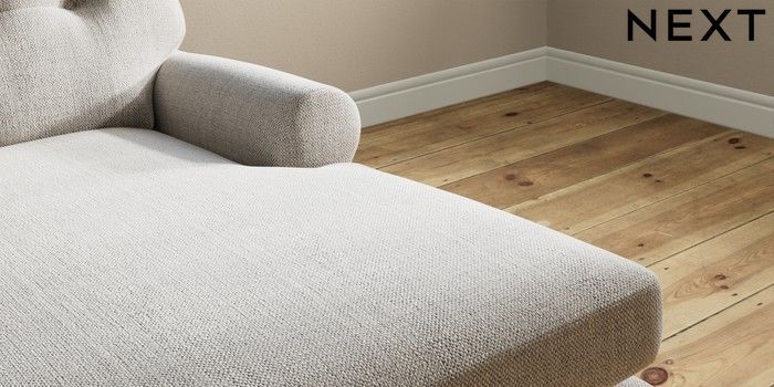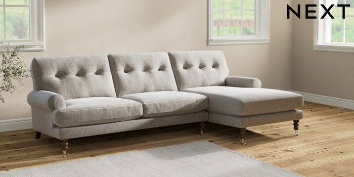 7.2.10 Erin Buttoned Back Deep Relaxed Sit Medium Sofa Chaise - Right Hand Chunky Weave Dove Grey High Classic Turned Chrome Castor - Mid | Made Click here to use our website with more accessibility support, for example screen readers