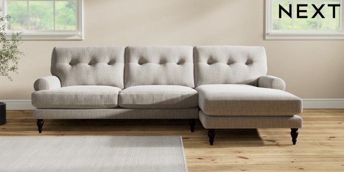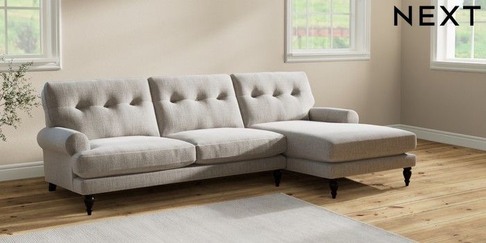 7.2.10 Erin Buttoned Back Deep Relaxed Sit Medium Sofa Chaise - Right Hand Chunky Weave Dove Grey High Classic Turned - Dark | Made Click here to use our website with more accessibility support, for example screen readers