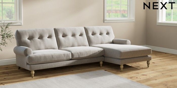 7.2.10 Erin Buttoned Back Deep Relaxed Sit Medium Sofa Chaise - Right Hand Chunky Weave Dove Grey High Classic Turned - Light | Made Click here to use our website with more accessibility support, for example screen readers