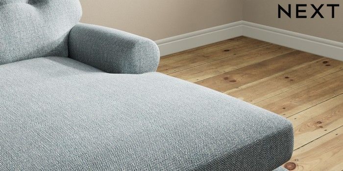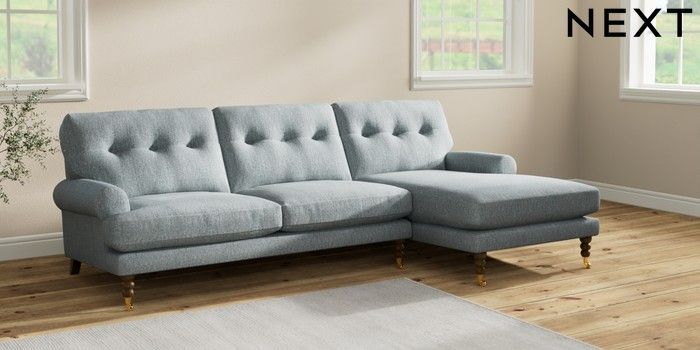 7.2.10 Erin Buttoned Back Deep Relaxed Sit Medium Sofa Chaise - Right Hand Chunky Weave Mid Blue High Classic Turned Brass Castor - Mid | Made Click here to use our website with more accessibility support, for example screen readers