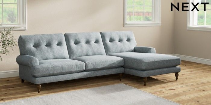 7.2.10 Erin Buttoned Back Deep Relaxed Sit Medium Sofa Chaise - Right Hand Chunky Weave Mid Blue High Classic Turned - Mid | Made Click here to use our website with more accessibility support, for example screen readers