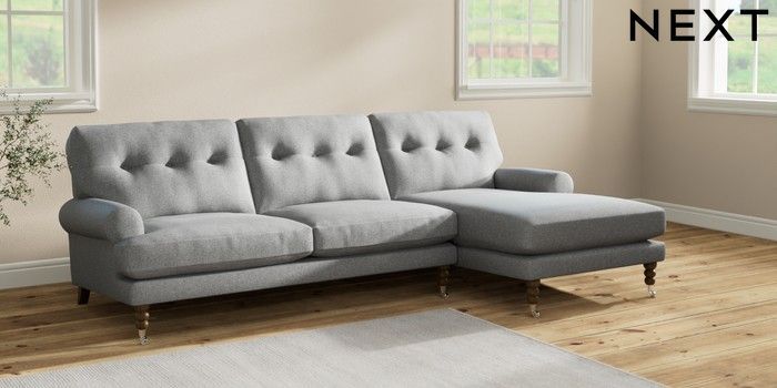 7.2.10 Erin Buttoned Back Deep Relaxed Sit Medium Sofa Chaise - Right Hand Chunky Weave Mid Grey High Classic Turned Chrome Castor - Mid | Made Click here to use our website with more accessibility support, for example screen readers