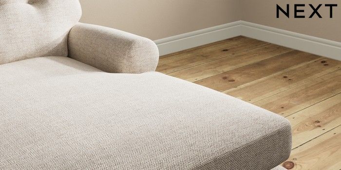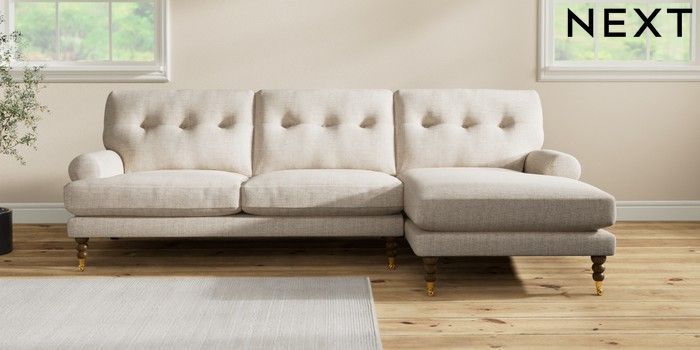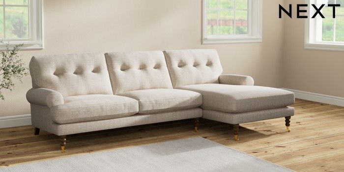 7.2.10 Erin Buttoned Back Deep Relaxed Sit Medium Sofa Chaise - Right Hand Chunky Weave Mid Natural High Classic Turned Brass Castor - Mid | Made Click here to use our website with more accessibility support, for example screen readers