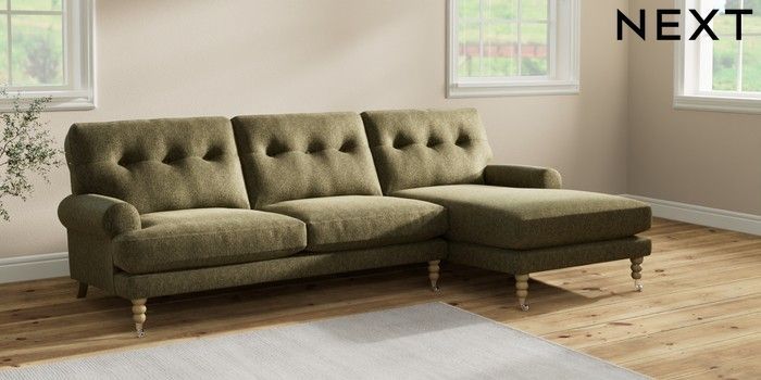 7.2.10 Erin Buttoned Back Deep Relaxed Sit Medium Sofa Chaise - Right Hand Cotswold Chenille Dark Green High Classic Turned Chrome Castor - Light | Made Click here to use our website with more accessibility support, for example screen readers