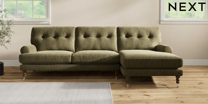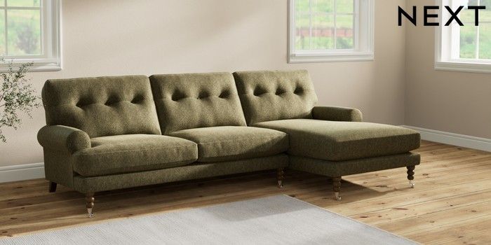 7.2.10 Erin Buttoned Back Deep Relaxed Sit Medium Sofa Chaise - Right Hand Cotswold Chenille Dark Green High Classic Turned Chrome Castor - Mid | Made Click here to use our website with more accessibility support, for example screen readers