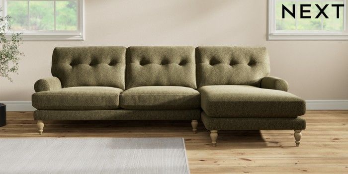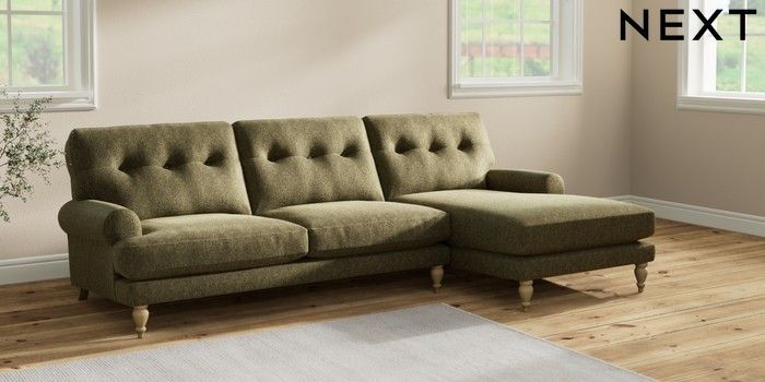 7.2.10 Erin Buttoned Back Deep Relaxed Sit Medium Sofa Chaise - Right Hand Cotswold Chenille Dark Green High Classic Turned - Light | Made Click here to use our website with more accessibility support, for example screen readers