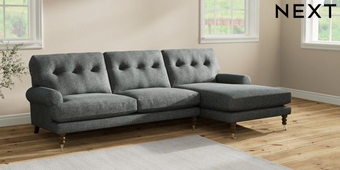 7.2.10 Erin Buttoned Back Deep Relaxed Sit Medium Sofa Chaise - Right Hand Cotswold Chenille Dark Grey High Classic Turned Chrome Castor - Mid | Made Click here to use our website with more accessibility support, for example screen readers