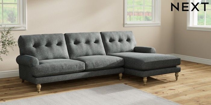 7.2.10 Erin Buttoned Back Deep Relaxed Sit Medium Sofa Chaise - Right Hand Cotswold Chenille Dark Grey High Classic Turned - Light | Made Click here to use our website with more accessibility support, for example screen readers
