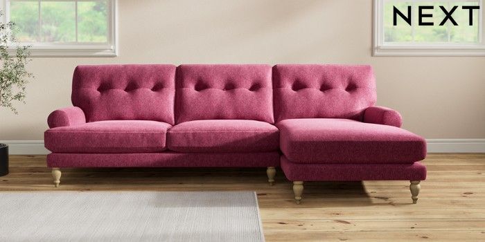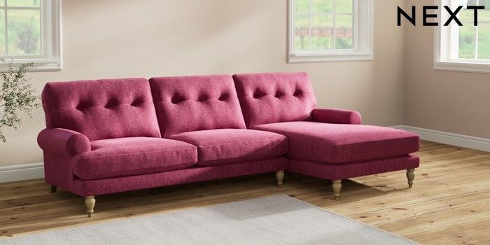 7.2.10 Erin Buttoned Back Deep Relaxed Sit Medium Sofa Chaise - Right Hand Cotswold Chenille Dark Raspberry Pink High Classic Turned - Light | Made Click here to use our website with more accessibility support, for example screen readers