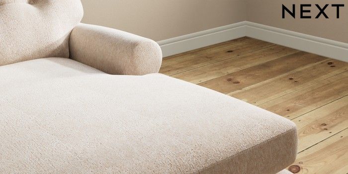 7.2.10 Erin Buttoned Back Deep Relaxed Sit Medium Sofa Chaise - Right Hand Cotswold Chenille Light Natural High Classic Turned Brass Castor - Light | Made Click here to use our website with more accessibility support, for example screen readers