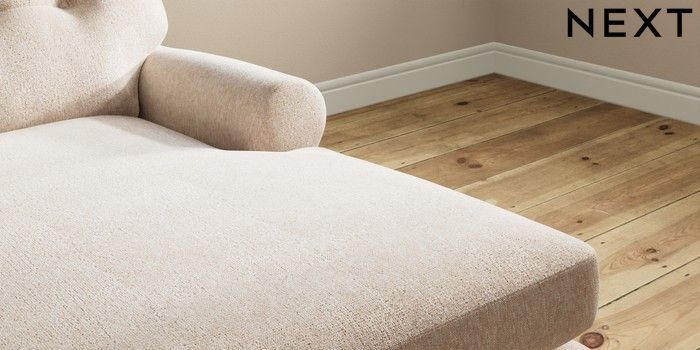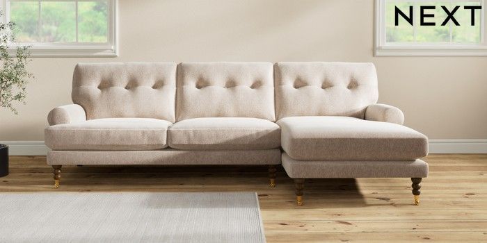 7.2.10 Erin Buttoned Back Deep Relaxed Sit Medium Sofa Chaise - Right Hand Cotswold Chenille Light Natural High Classic Turned Brass Castor - Mid | Made Click here to use our website with more accessibility support, for example screen readers