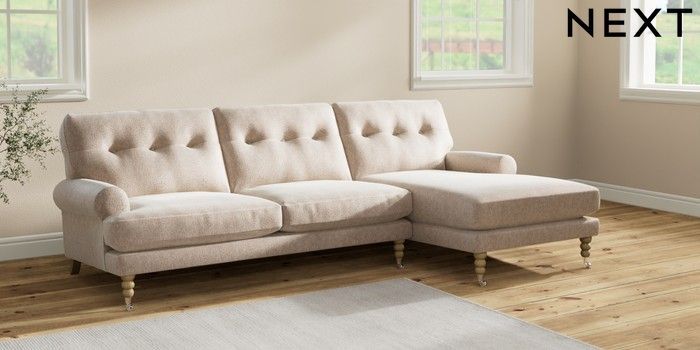 7.2.10 Erin Buttoned Back Deep Relaxed Sit Medium Sofa Chaise - Right Hand Cotswold Chenille Light Natural High Classic Turned Chrome Castor - Light | Made Click here to use our website with more accessibility support, for example screen readers