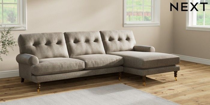 7.2.10 Erin Buttoned Back Deep Relaxed Sit Medium Sofa Chaise - Right Hand Cotswold Chenille Mid Mink Brown High Classic Turned Brass Castor - Mid | Made Click here to use our website with more accessibility support, for example screen readers