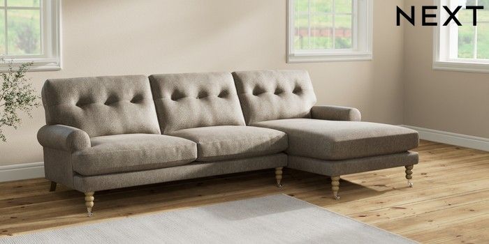 7.2.10 Erin Buttoned Back Deep Relaxed Sit Medium Sofa Chaise - Right Hand Cotswold Chenille Mid Mink Brown High Classic Turned Chrome Castor - Light | Made Click here to use our website with more accessibility support, for example screen readers