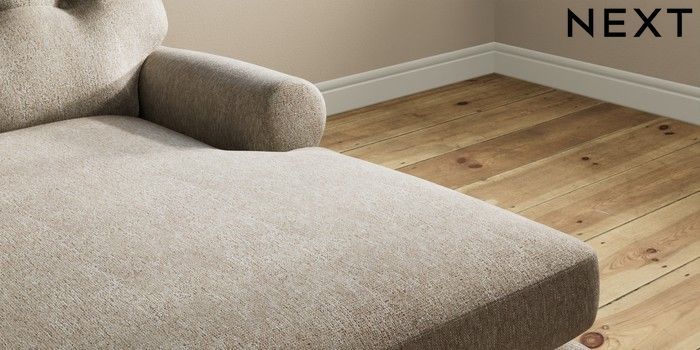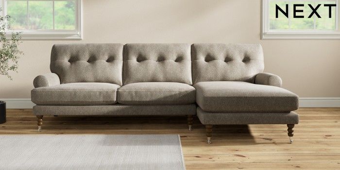 7.2.10 Erin Buttoned Back Deep Relaxed Sit Medium Sofa Chaise - Right Hand Cotswold Chenille Mid Mink Brown High Classic Turned Chrome Castor - Mid | Made Click here to use our website with more accessibility support, for example screen readers