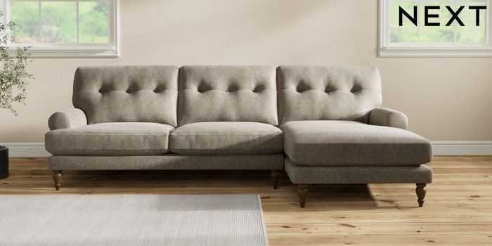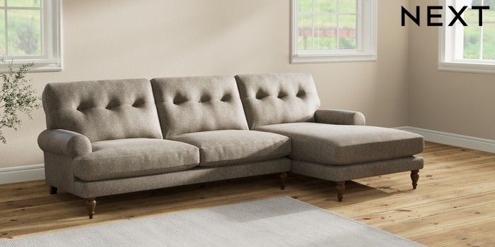 7.2.10 Erin Buttoned Back Deep Relaxed Sit Medium Sofa Chaise - Right Hand Cotswold Chenille Mid Mink Brown High Classic Turned - Mid | Made Click here to use our website with more accessibility support, for example screen readers